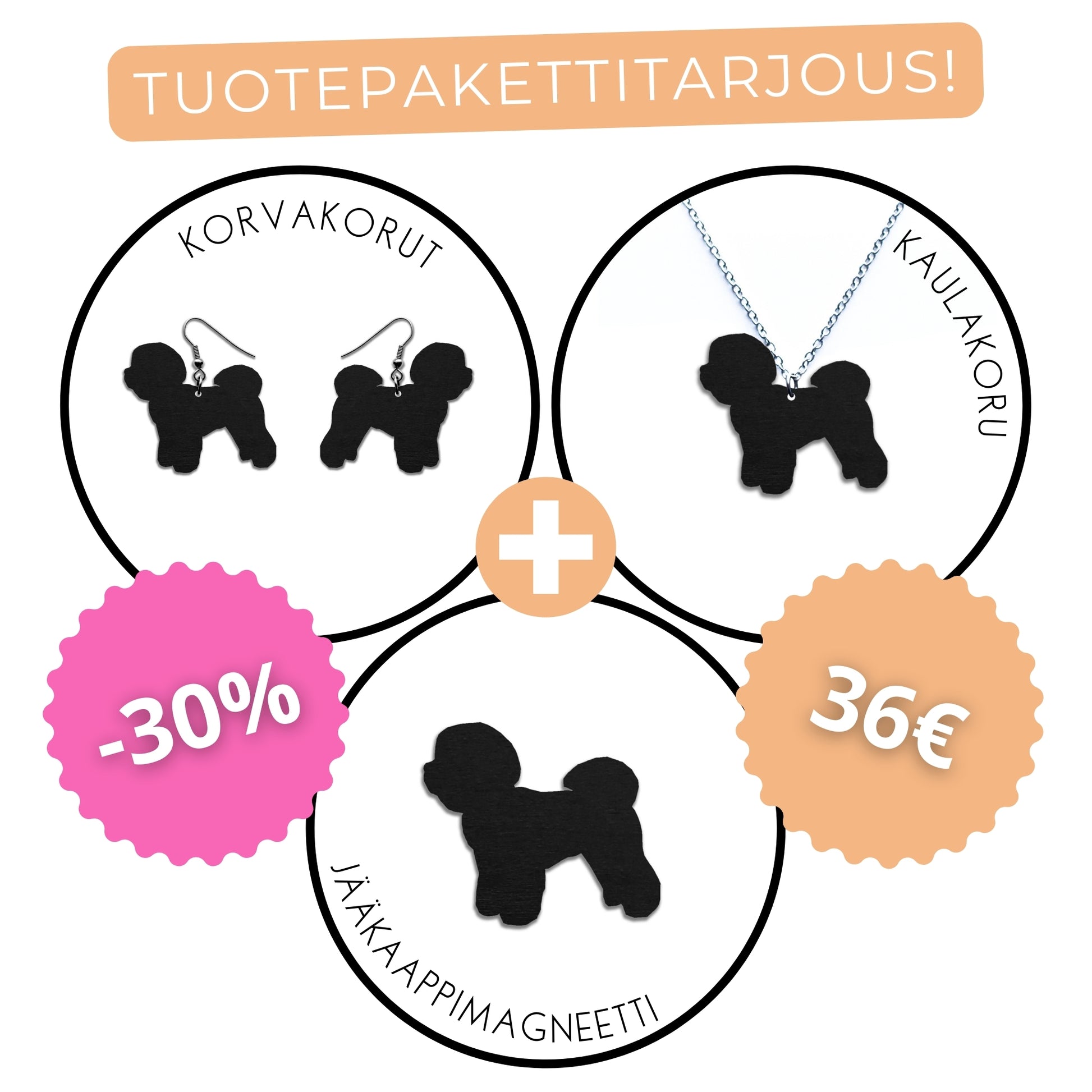 Bichon frise -tuotepaketti sisältää korvakorut, kaulakorun ja jääkaappimagneetin nyt pakettihintaan 😍